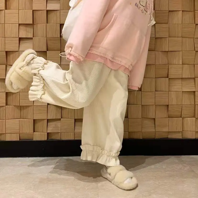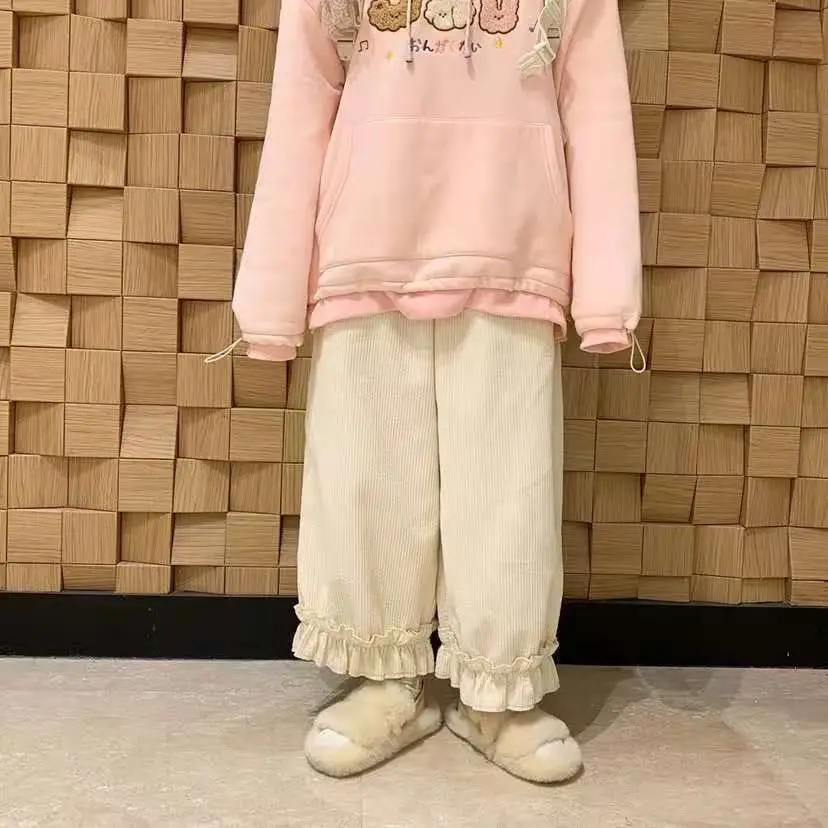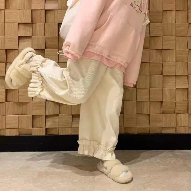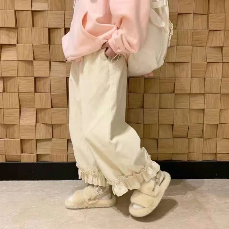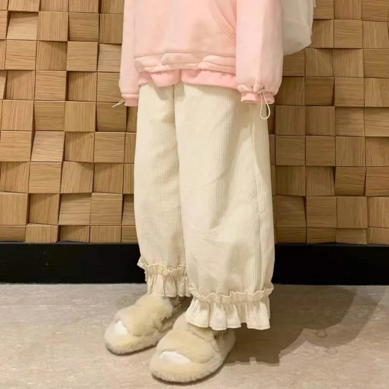 Corduroy Casual Pants Women Solid Lovely Ruffles Students